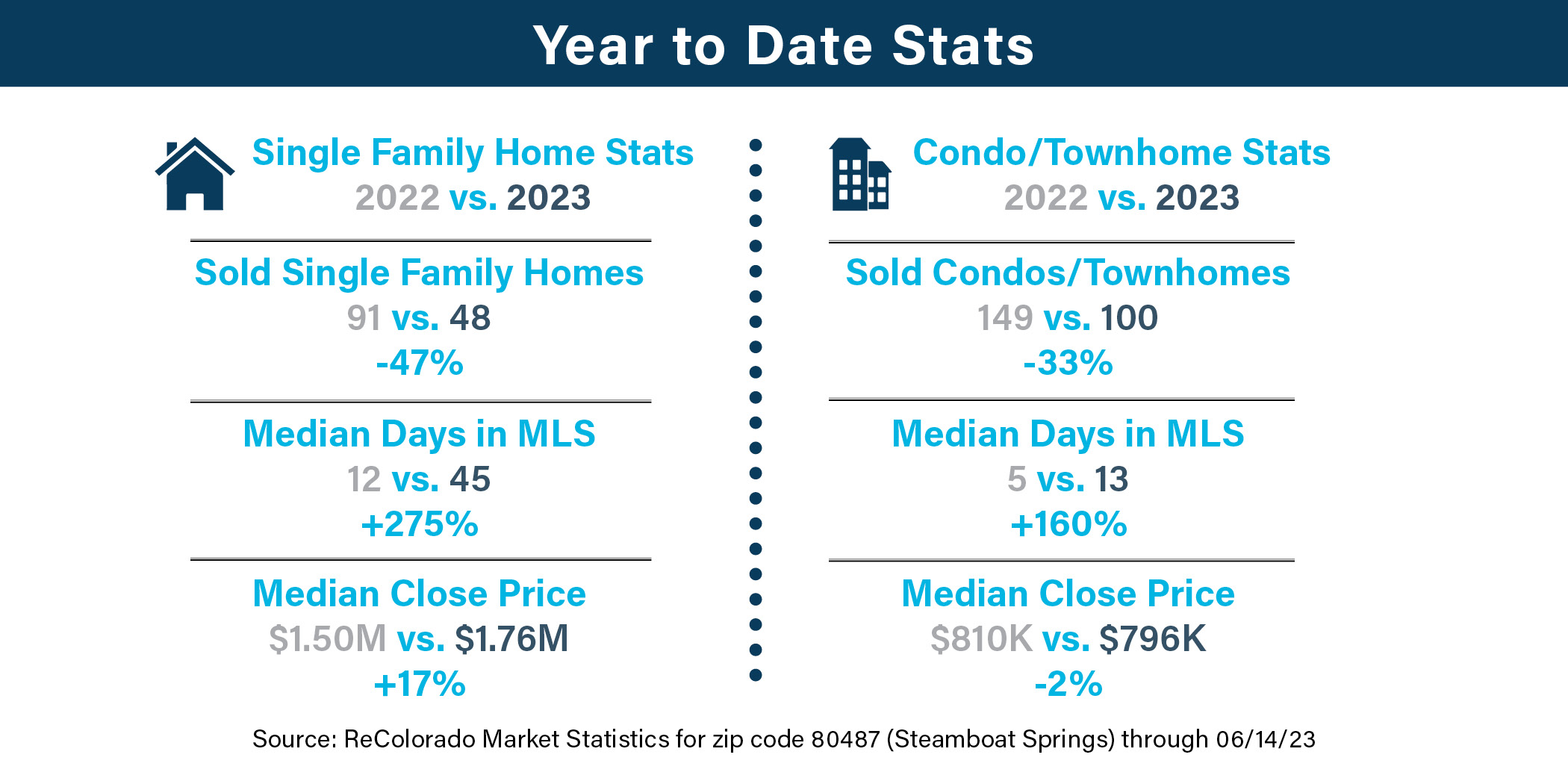 As of June 13, 2023, Routt County has 127 active residential listings. That’s up from 79 this time last month, and down from this time last year (120). The number of currently-pending listings (100) is up from this time last month (79), and also up from this time last year (69). Closed listings in May county-wide were up (64) compared to the month prior, March (49), and down compared to May of 2022 (81).
