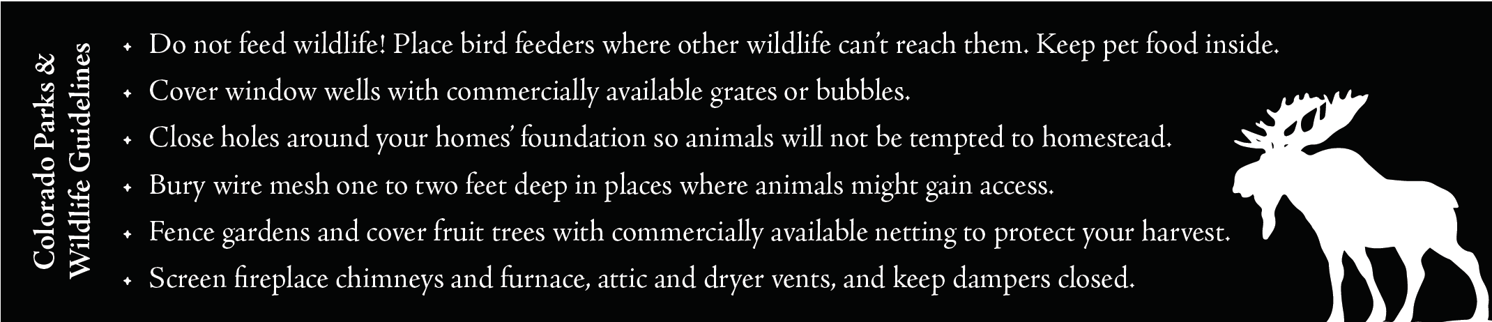 In Steamboat, black bears have become accustomed to foraging in household trash and dumpsters. Recently, a young cinnamon colored bear, who was frequently dining out of Old Town resident’s trash cans, was euthanized after an unsuccessful relocation. This is preventable if residents use bear proof cans and don’t leave their trash out overnight. Deer, elk and moose have been known to bed down in backyards, posing the never-ending questions of how to avoid attracting unwanted guests. Follow Colorado Park and Wildlife’s Guidelines to learn how to prevent unwanted wildlife encounters: