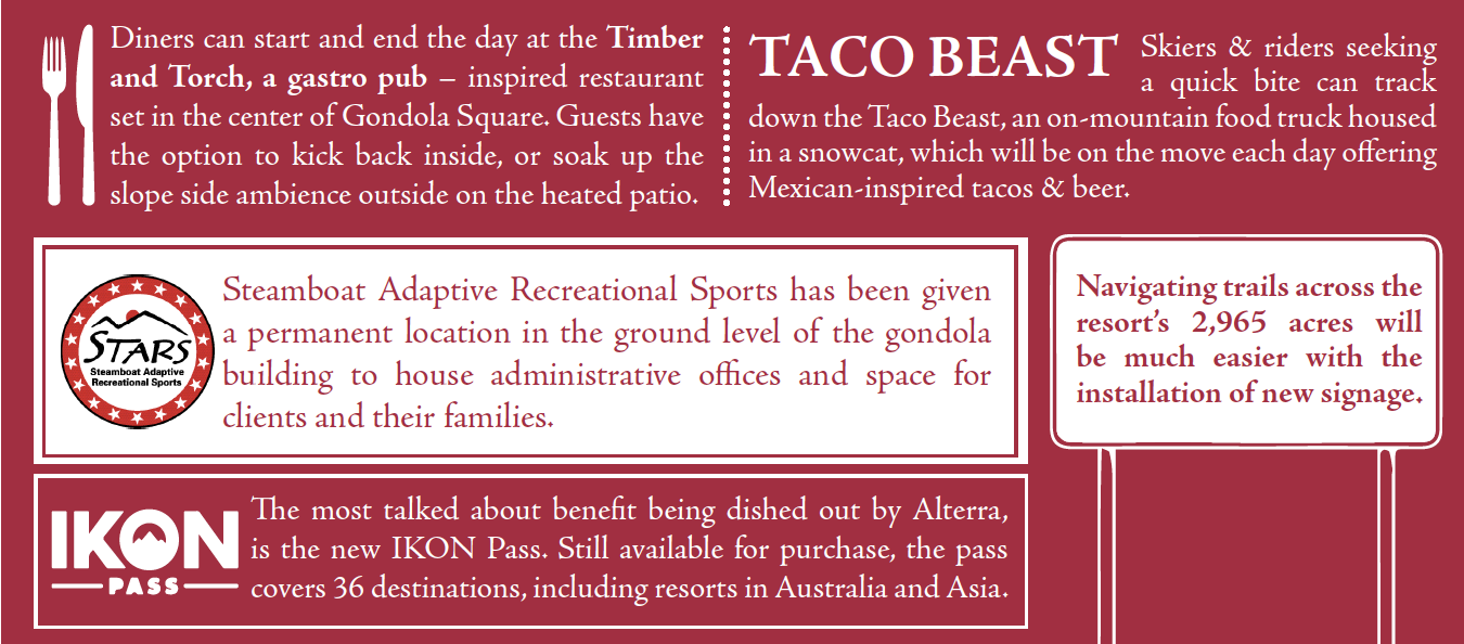 On November 21, guests at the Steamboat Ski Resort will be toasting the start of ski season with free mimosas and “champagne” powder donuts. New owner, Alterra Mountain Company, is hosting a party-style event with entertainment by The Ute Indian Tribe snow dancers and free Ohana-designed t-shirts for the first 100 skiers and riders. Guests on and off the slopes this winter will notice a series of changes, which signal the start of Alterra’s long-term Master Development Plan.