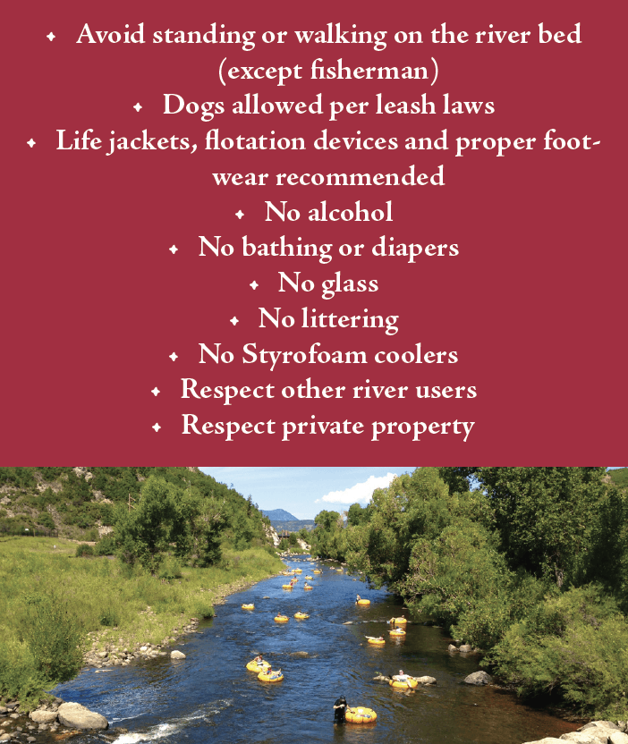 During warm summer days the cool water is a magnet for sunbaked tourists and locals. At peak times, the downtown stretch becomes Steamboats’ version of rush hour traffic. Friends of the Yampa, a non-profit organization and the City of Steamboat Springs formed a guideline for users, in order to protect the waterway.