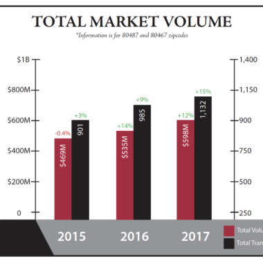 2017 was a very healthy year for the Steamboat Springs real estate market; in fact, it was the most robust year since 2007, right before the housing bubble and recession. Overall market volume in Steamboat and surrounding areas was up 12% to $598M in sale