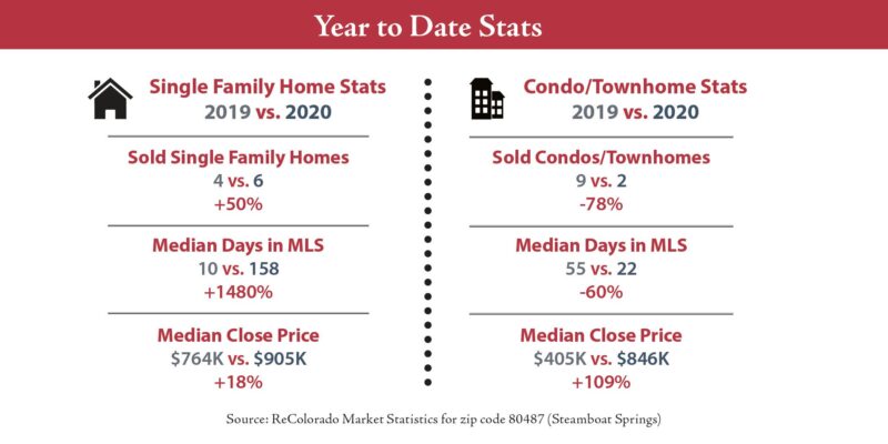 The active year-end took a significant bite out of inventory giving sellers a decided advantage. There are now only four months of inventory in Steamboat compared to over six months at the start of 2019. With only 276 active listings, buyers have been snapping up many new listings quickly, especially single family homes priced under $1M (still the category with the most demand and the lowest supply). Currently, there are only 24 single family homes under $1M for sale in Steamboat.