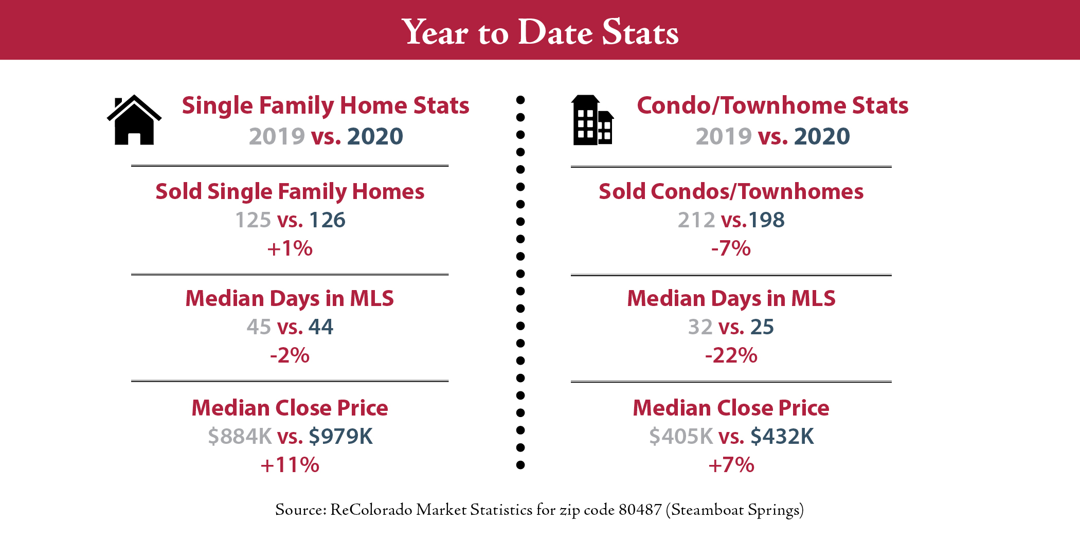 - Active inventory has fallen to all-time lows with only 250 properties for sale in Steamboat Springs, compared to 450 this time last year