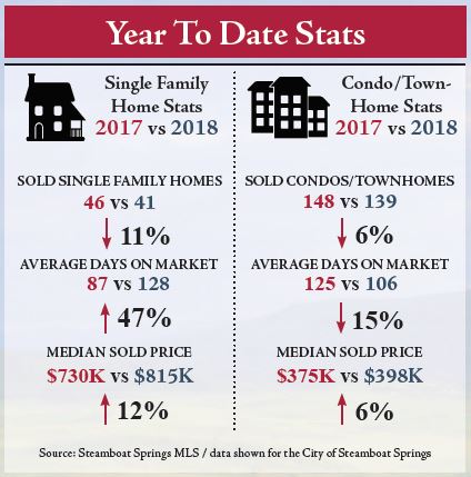 In most cities across the globe, spring is the time of year when the highest volume of properties hit the market. Steamboat is no exception and local buyers are hopeful to see significant supply added to help balance the high demand. While the 112 new listings that came on the market this March didn’t measure up to previous years, it was the highest number of new properties added in the last seven months. Year to date, 264 new properties have gone on the market, down 22% from 2017. Based on this activity, we expect that the same trend will continue in April and May: healthy but not the volume of past years. The market has held steady for the last six months with about 400 total active listings.
