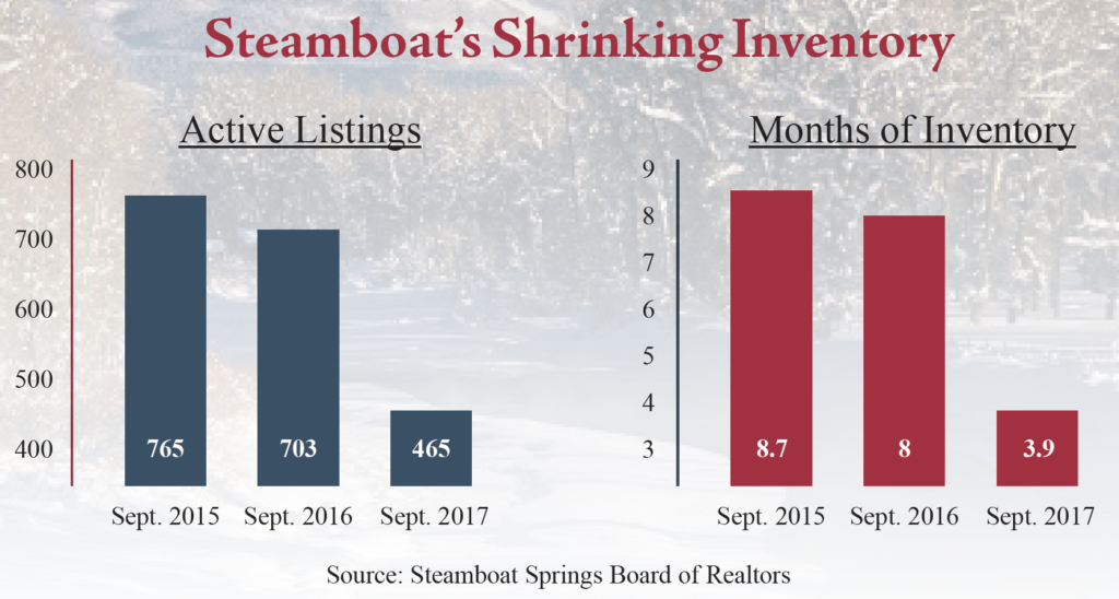 Steamboat had a hot summer! In Q3 of 2017, 13 single-family downtown homes sold for $9.25M in total sales, averaging $384/sf and 88 DOM (days on market). In the mountain area, 19 single-family homes sold for $19.35M in total sales, averaging $333/sf and 252 DOM. There are currently nine single-family downtown homes for sale and more than half have been on the market for a year or more. With such little inventory, why do they sit while others see multiple offers per day?