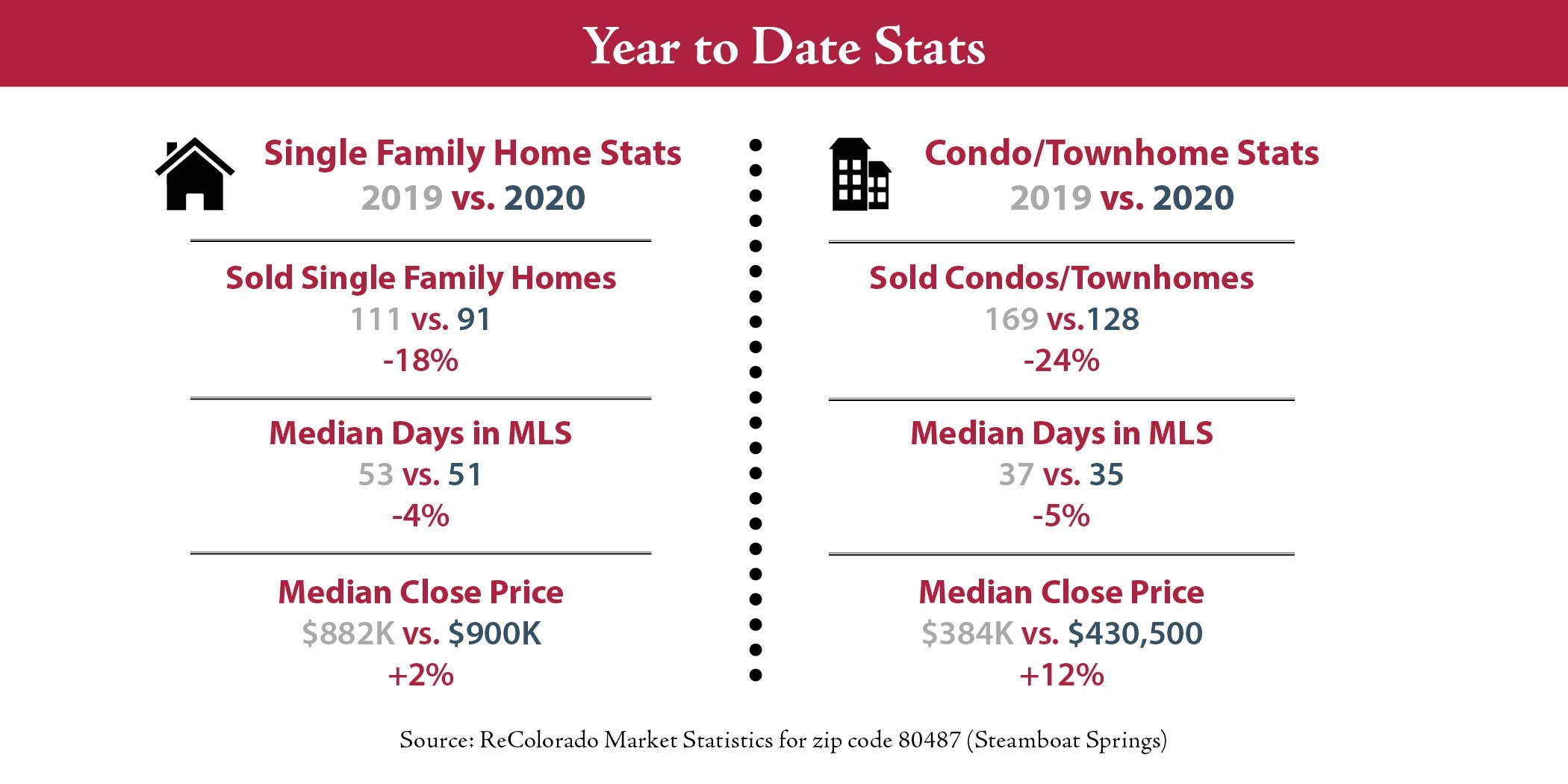 Like most of the country, low inventory in Steamboat continues to challenge home buyers with limited options. In previous years, active inventory spiked around 20% in June but this year it stayed relatively flat; this was perhaps caused by leery sellers who aren’t yet comfortable with potential buyers touring their homes. We now have 395 active residential listings down 29% from this time last year.